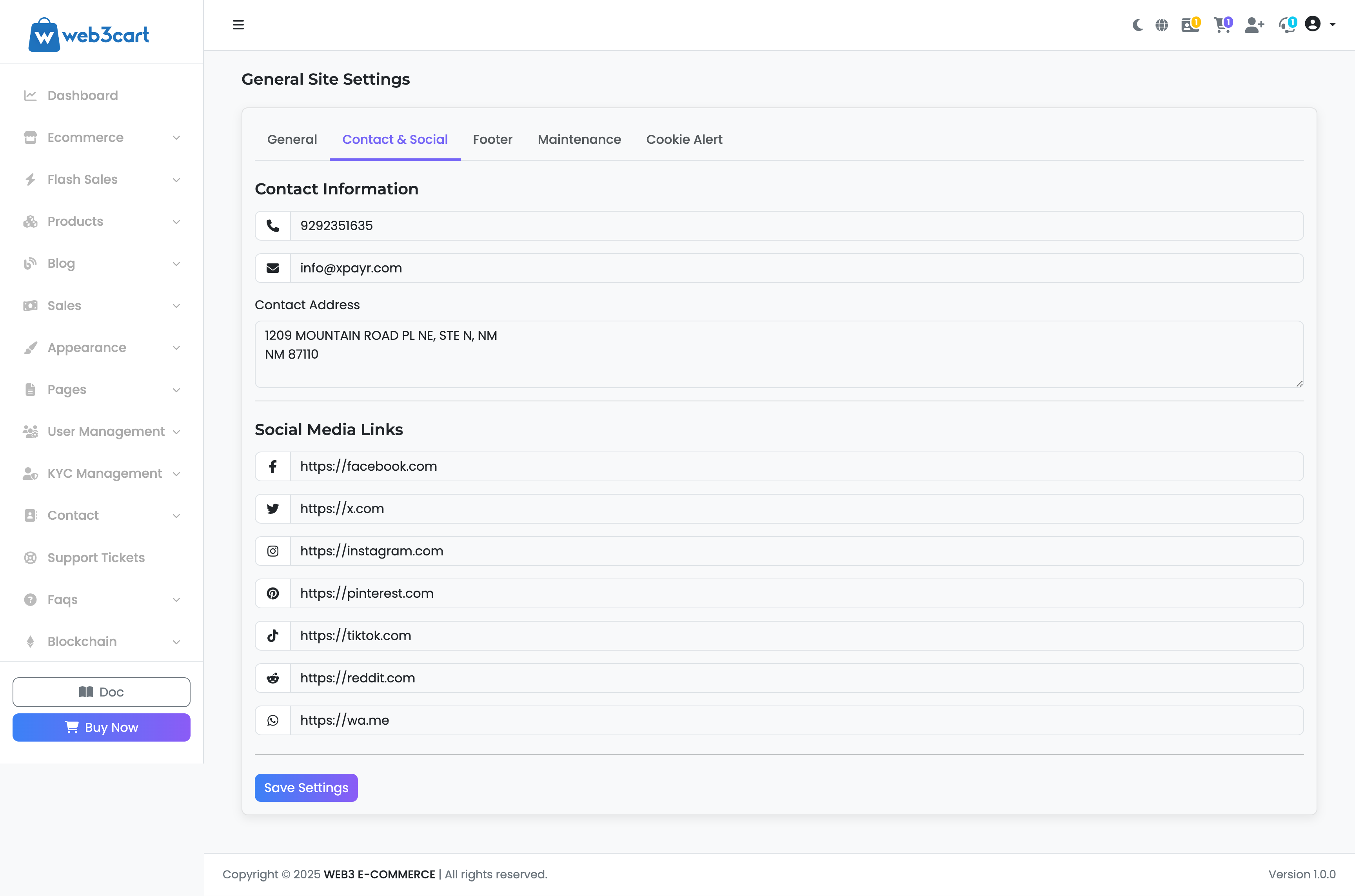 Settings: Contact & Social Tab